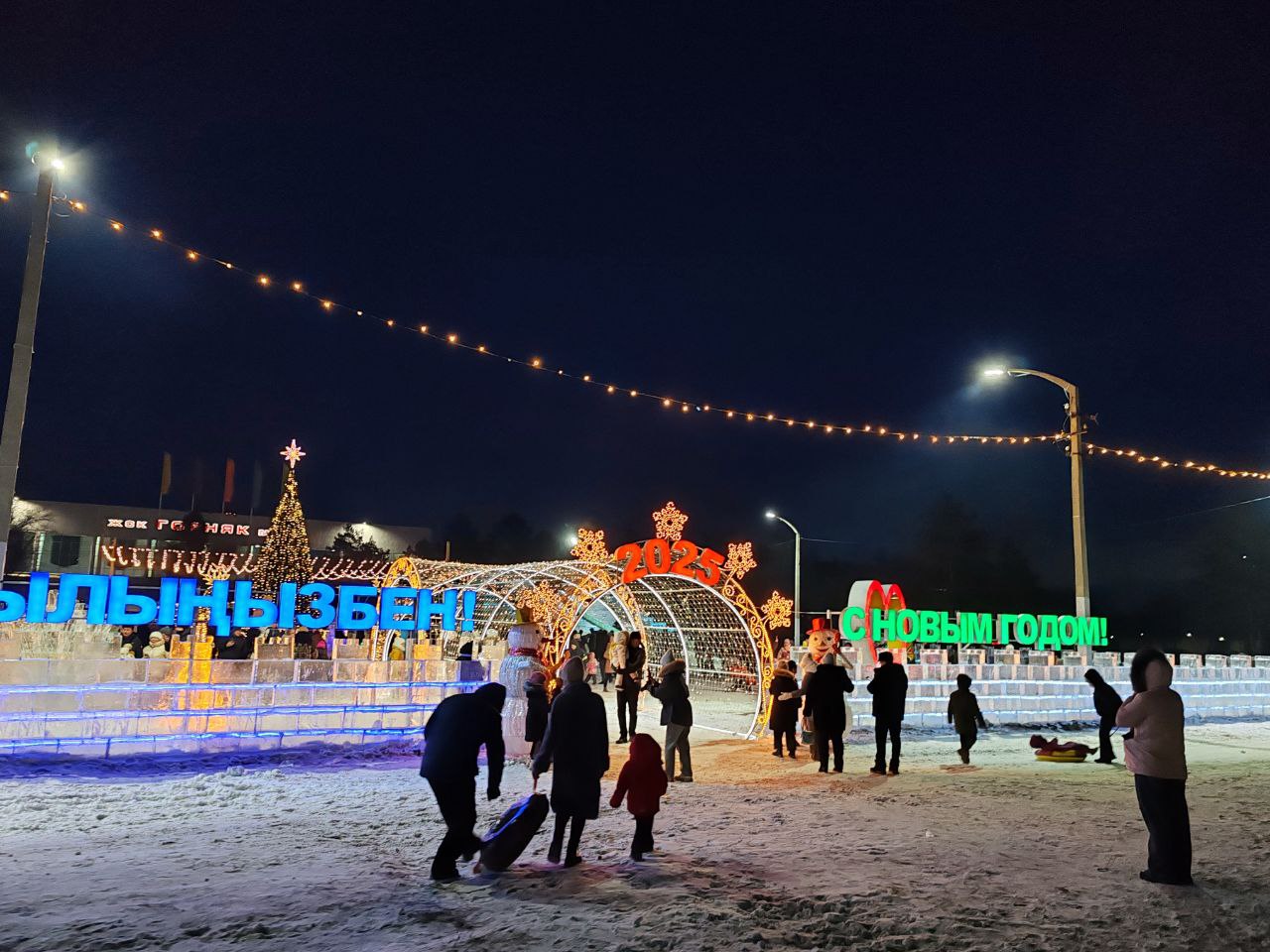 Сегодня официально открыт ледяной городок в Рудном, называется он «Зимние забавы». Впервые за долгие годы нас порадовали настоящей зимней сказкой. Спасибо мастерам-строителям из ИП «Погода в Доме» (г. Рудный). Постарались ребята на совесть. Здесь и высокая двускатная ледяная горка, горка поменьше, ледяной лабиринт, каток с «шатром» из иллюминации, аттракционы «тарелочка». Горит огнями высокая 11-метровая елка, есть много световых инсталляций, топиарные фигурки «Смешариков» и фотозона. У катка работает прокат коньков и тюбингов - 1000 тенге за час.