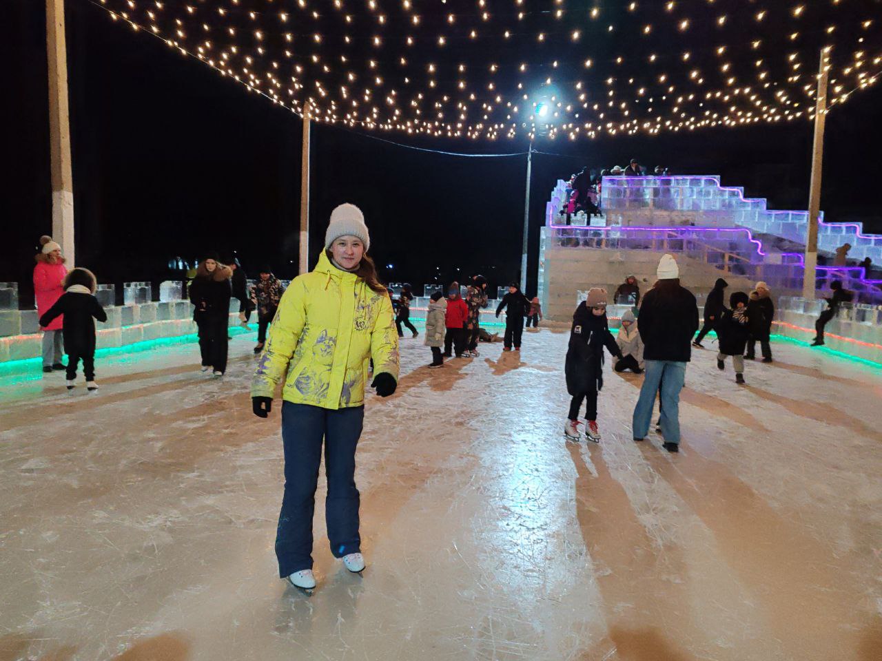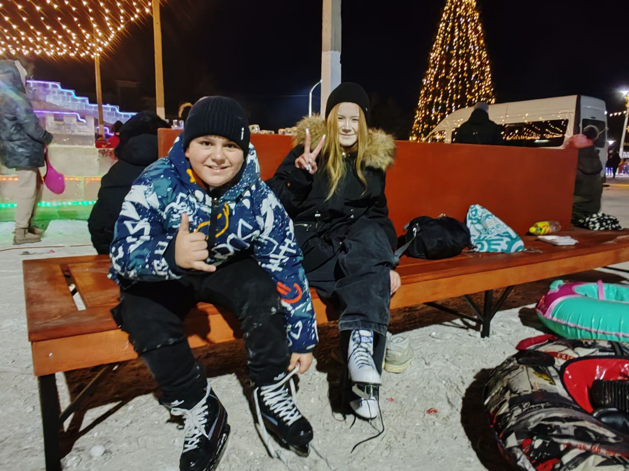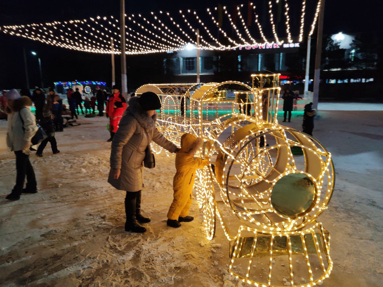 По этой печальной причине решено было просто зажечь огни на елке городка и включить всю иллюминацию. Ну а первые посетители не заставили себя долго ждать: к 18 часам городок наполнился людьми - детьми и взрослыми. За периметром, ближе к Ледовому дворцу спорта, продавали шашлыки и горячие напитки.