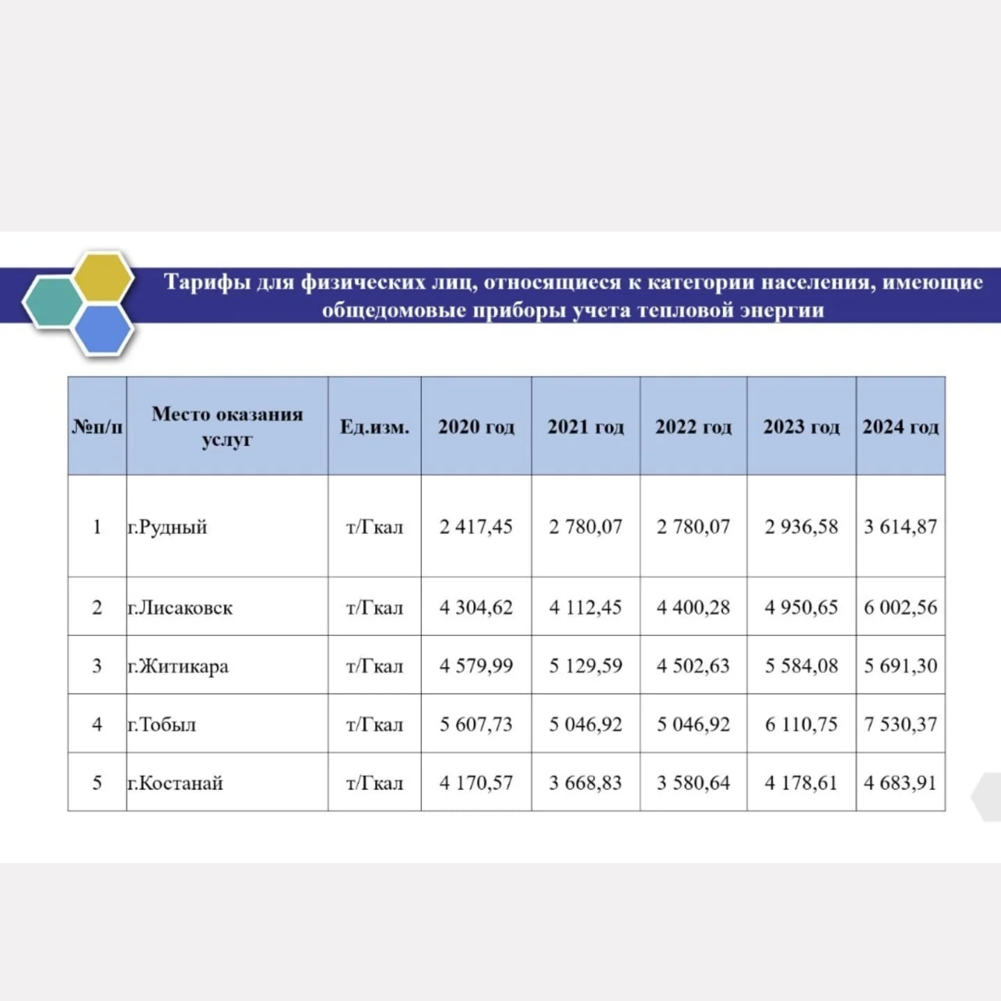 Приказами Департамента Комитета по регулированию естественных монополий Министра национальной экономики Республики Казахстан по Костанайской области от 9 января 2025 года для ТОО «Рудненские тепловые сети» утверждены тарифы в долгосрочном порядке на 2025-2029 годы с вводом в действие с 1 марта 2025 года. Пока речь о среднеотпускном тарифе. Для Рудного он составит 10 201,18 тенге/Гкал (без НДС), конкретно на 2025 год - 10 452,20. Напомним, с 1 октября 2024 года действовал тариф 9284,51 тенге/Гкал.