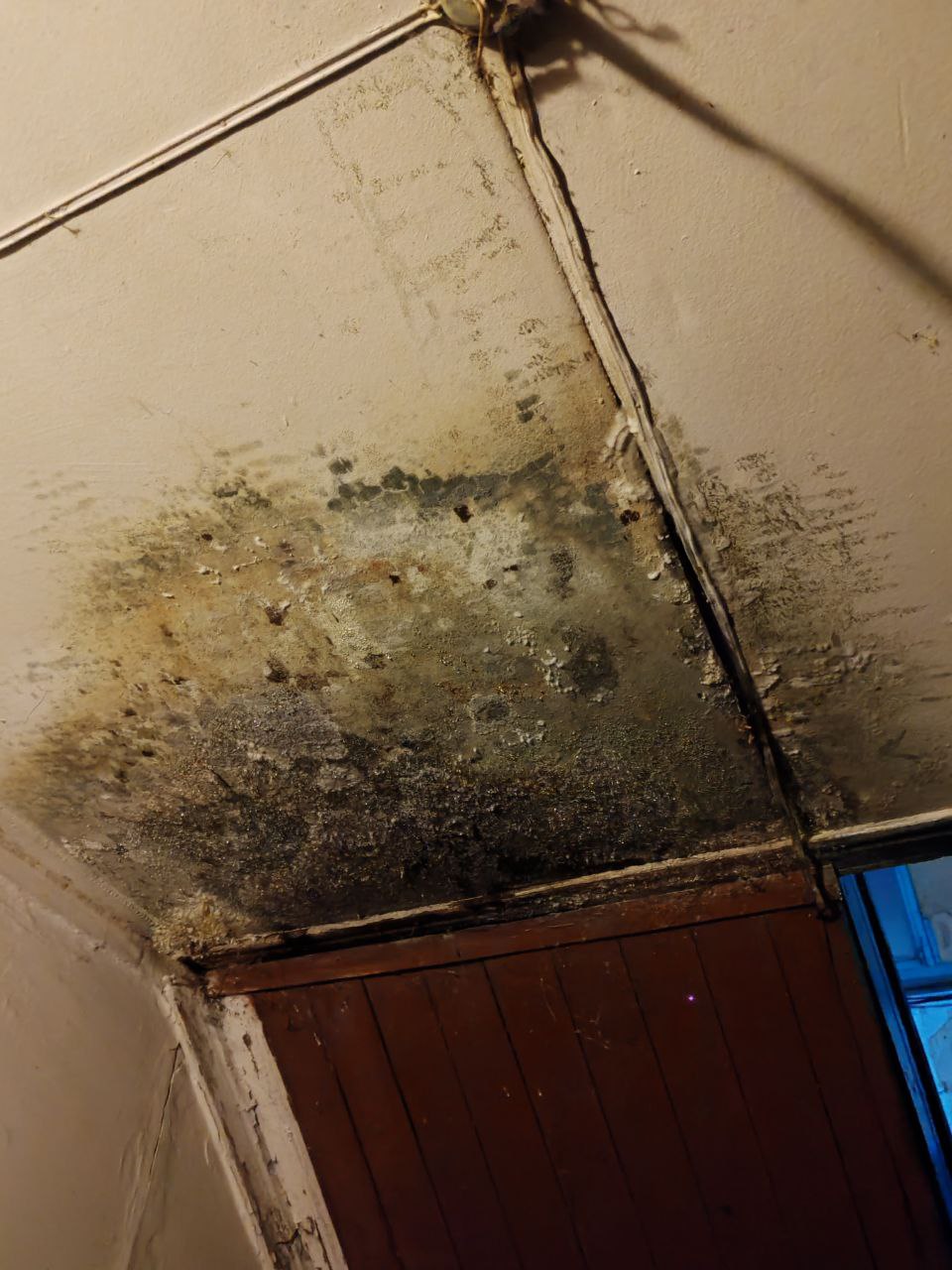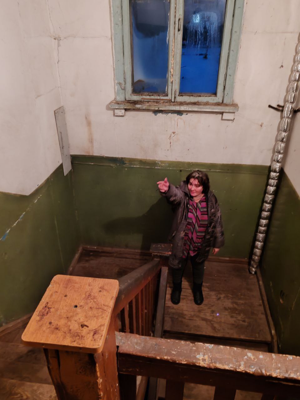 Если честно, то в этом доме не то что жить, просто находиться страшновато. Деревянные лестничные пролеты отсырели и гниют, повсюду запах сырости, плесень, стены на первом этаже в подъезде влажные, покрыты изморозью.