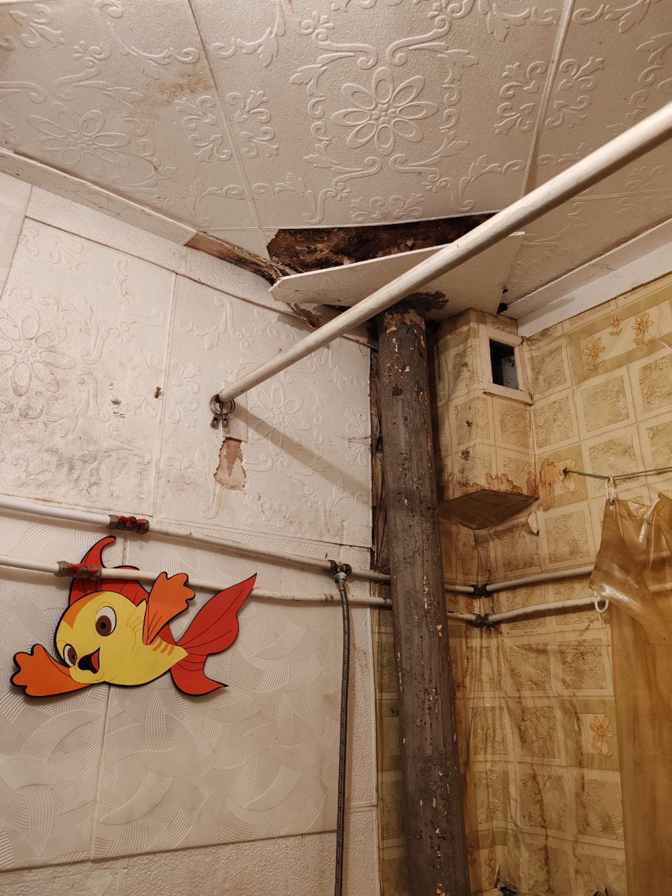 31 января в санузле 7-й квартиры обвалился потолок. Балки просто сгнили. И семья из трех человек несколько дней наблюдала небо через дыры в шифере. Хорошо, что обрушение произошло в 4 утра, в санузле никого не было, и обошлось без жертв. К моменту визита журналиста портала iagorod.kz 5 февраля мужчины своими силами, как могли, сделали временный потолок из фанеры. В кухне, кстати, потолок уже выглядит угрожающе.