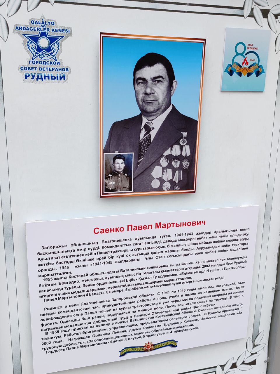- Саенко Павел Мартынович – в годы войны прошел курсы трактористов и подвозил снаряды на линию фронта. Был ранен, подорвался на минном поле. После госпиталя вернулся в строй. В 1946 г. награжден медалью «За доблестный труд в Великой Отечественной войне 1941-1945 г.г.». В 1955 году приехал на Целину в совхоз Баталинский Костанайской области. Работал бригадиром, управляющим, председателем сельского совета. В Рудном проживает с 2002 года.