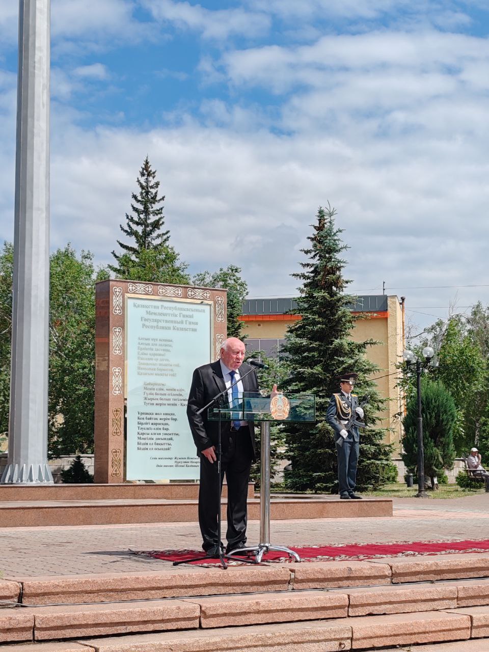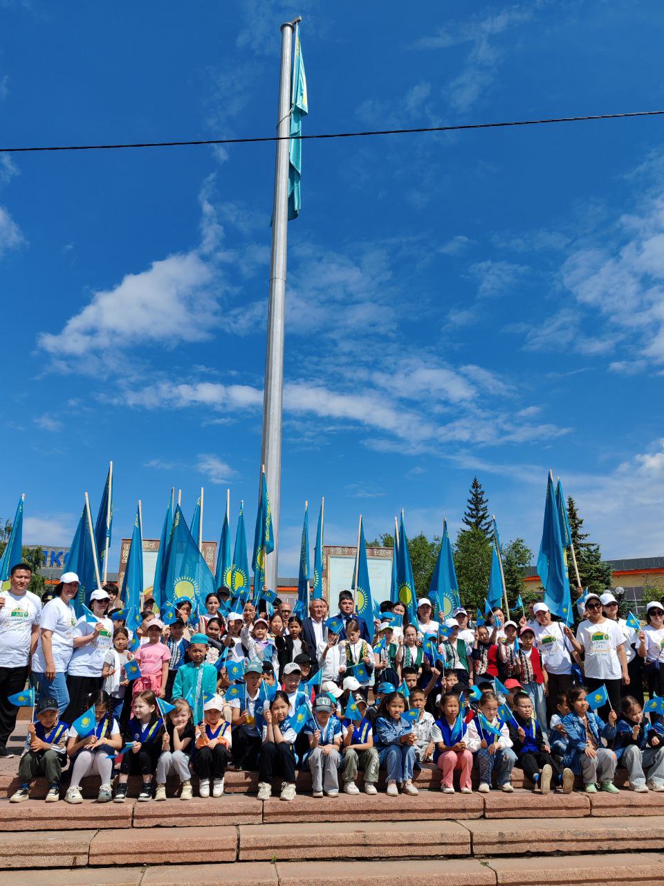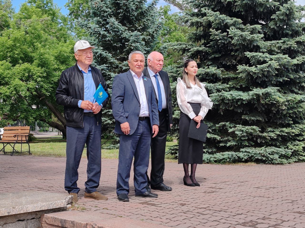 В 11 часов на центральной площади, под звуки государственного Гимна, состоялась торжественная церемония поднятия флага Республики Казахстан. У экспозиции государственных символов был выставлен почетный караул, а на самой площади собрались школьники, студенты, наши аксакалы, сотрудники госучреждений, акимата, СМИ.