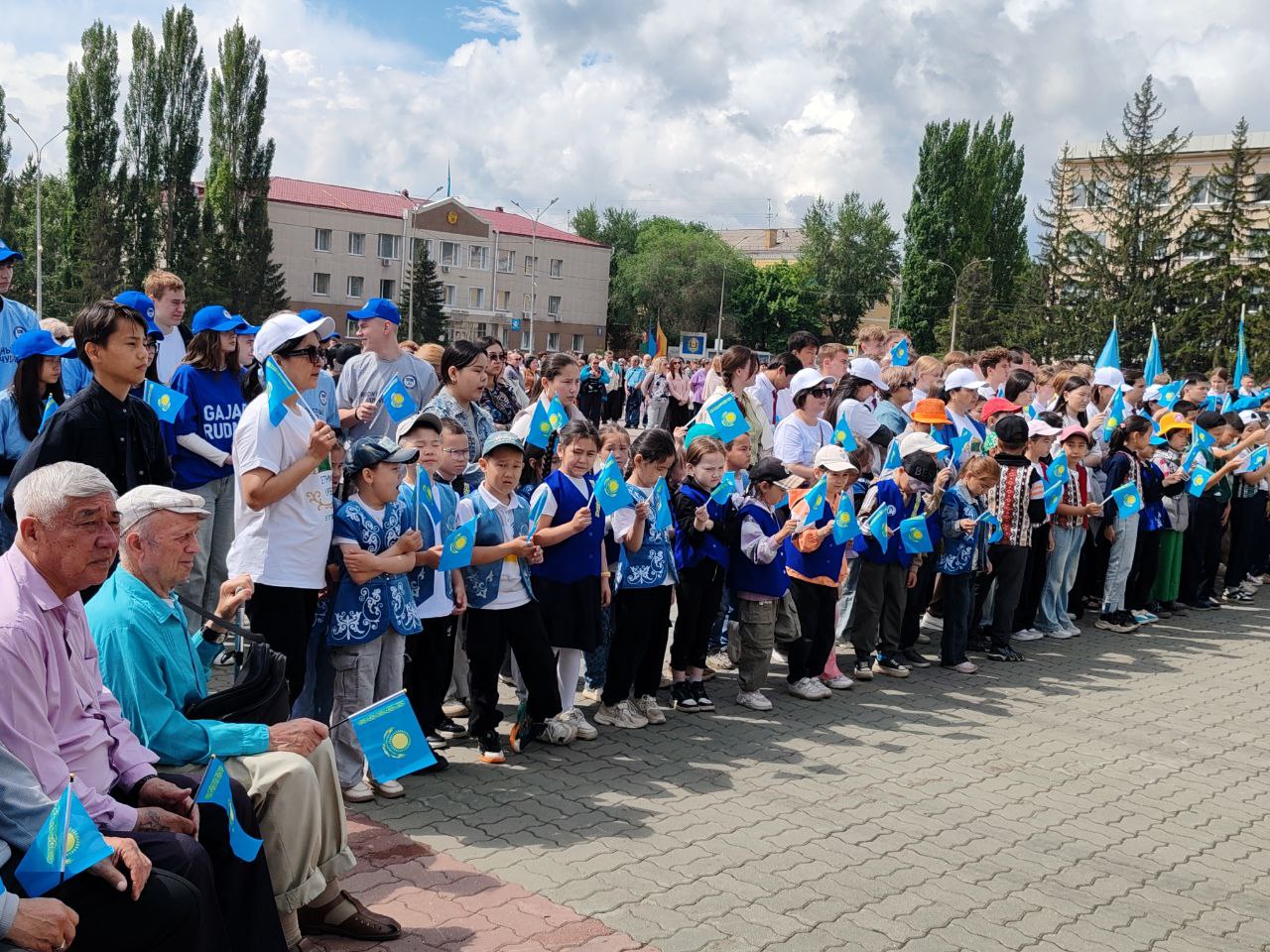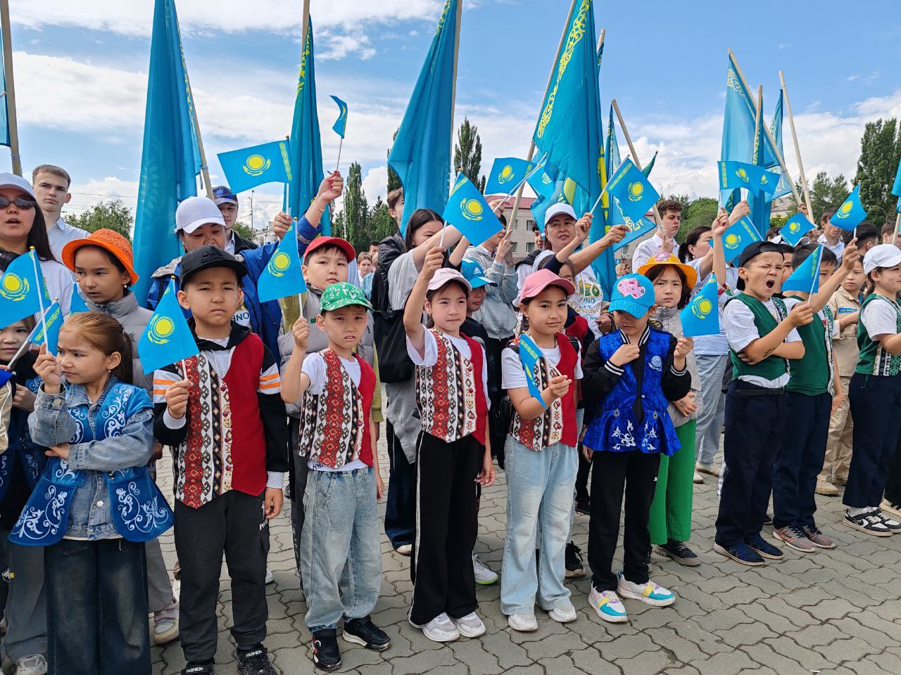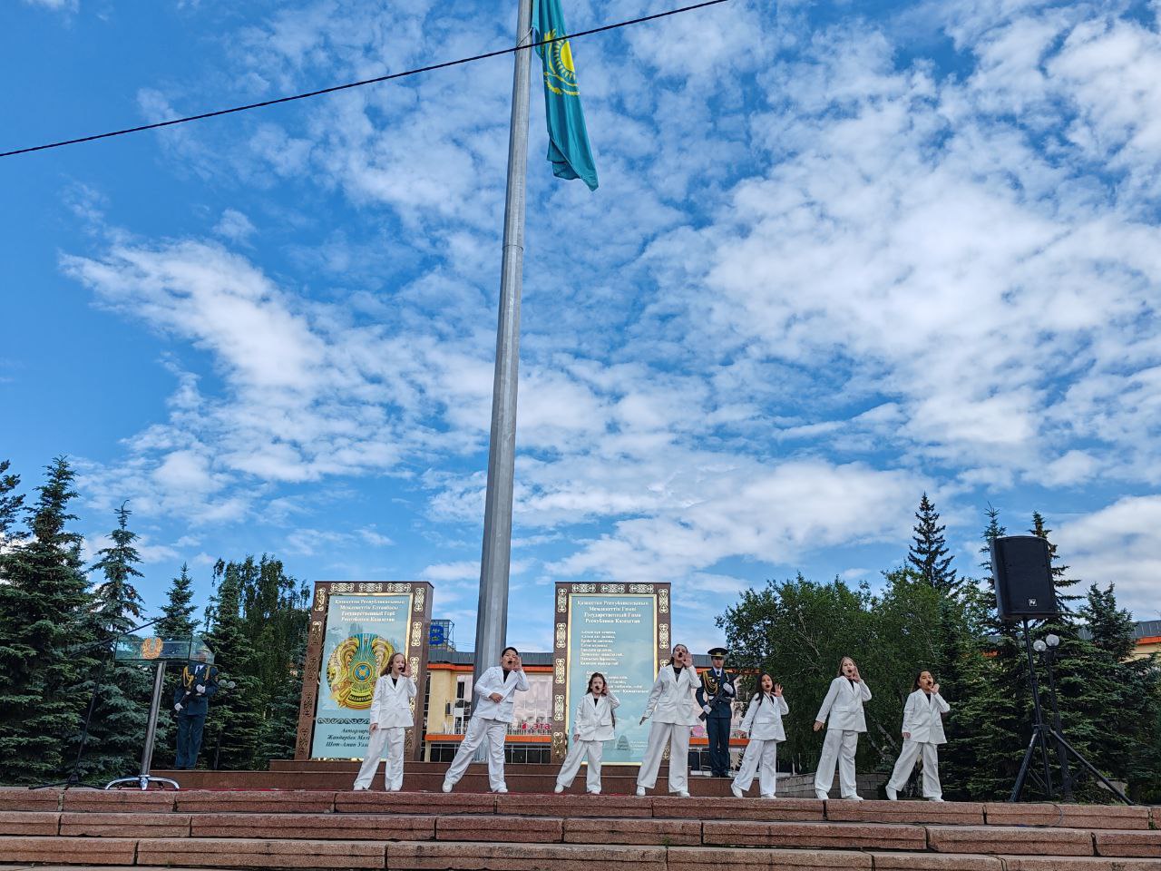 В 11 часов на центральной площади, под звуки государственного Гимна, состоялась торжественная церемония поднятия флага Республики Казахстан. У экспозиции государственных символов был выставлен почетный караул, а на самой площади собрались школьники, студенты, наши аксакалы, сотрудники госучреждений, акимата, СМИ.