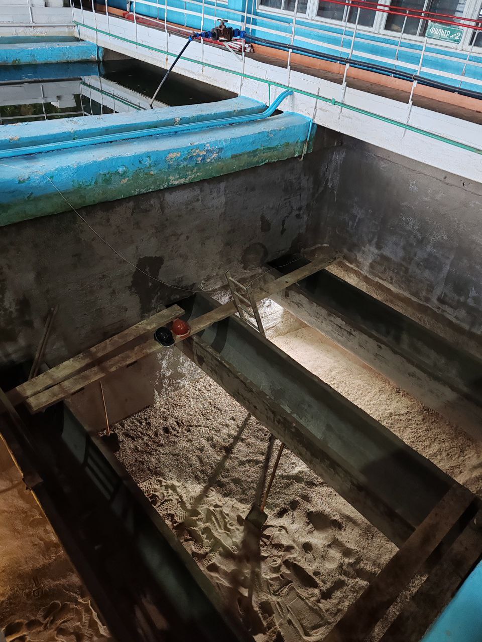- На фильтровальной станции №1 идет капитальный ремонт фильтра №2. Всего их 6, и ежегодно мы ремонтируем по одному, ориентируясь на анализ лаборатории. Фильтр состоит из фильтрующих элементов: щебень трех фракций, кварцевый песок и антрацит. Загрузка порядка 90 тонн материалов – трудоемкий и отчасти ручной труд. Все делаем своими силами. Смета на ремонт фильтра 45 млн тенге, - рассказывает журналистам Алексей Жиляев.