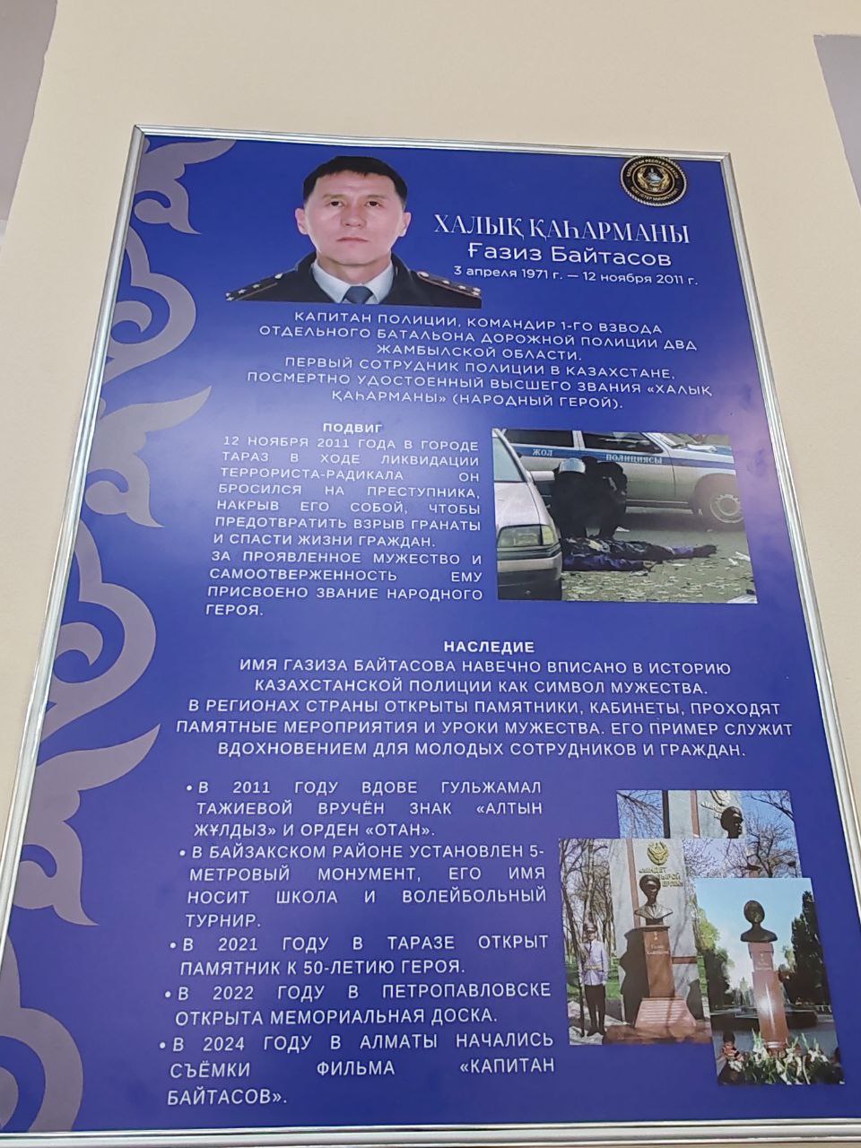 Пятиклассникам, которые отныне будут носить гордое звание «Жас сақшы», рассказали о подвиге полицейского. В ноябре 2011 года в Таразе произошел теракт, жертвами которого стали семь человек. Командир 1-го взвода отдельного батальона дорожной полиции Департамента внутренних дел, капитан полиции Газиз Байтасов погиб в ходе задержания особо опасного преступника, который напал на оружейный магазин, угнал автомобиль и убил нескольких сотрудников правоохранительных органов. В ходе преследования Байтасов добрался до террориста и повалил его на землю: спустя некоторое время преступник подорвал себя и Байтасова гранатой. Газиз Байтасов был посмертно удостоен звания «Халық Қаһарманы» - Народного Героя Казахстана. Его подвиг стал символом мужества, верности присяге и преданности долгу.