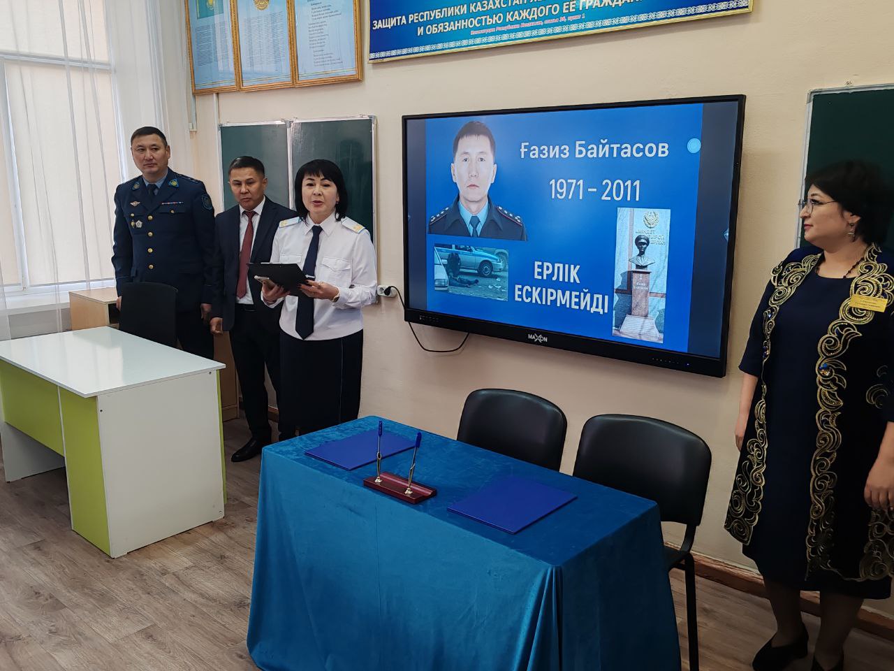 Новый кабинет, на открытии которого присутствовало руководство Управления полиции Рудного и Департамента полиции Костанайской области, носит имя полицейского Газиза Байтасова, героически погибшего при исполнении служебных обязанностей 12 ноября 2011 года.