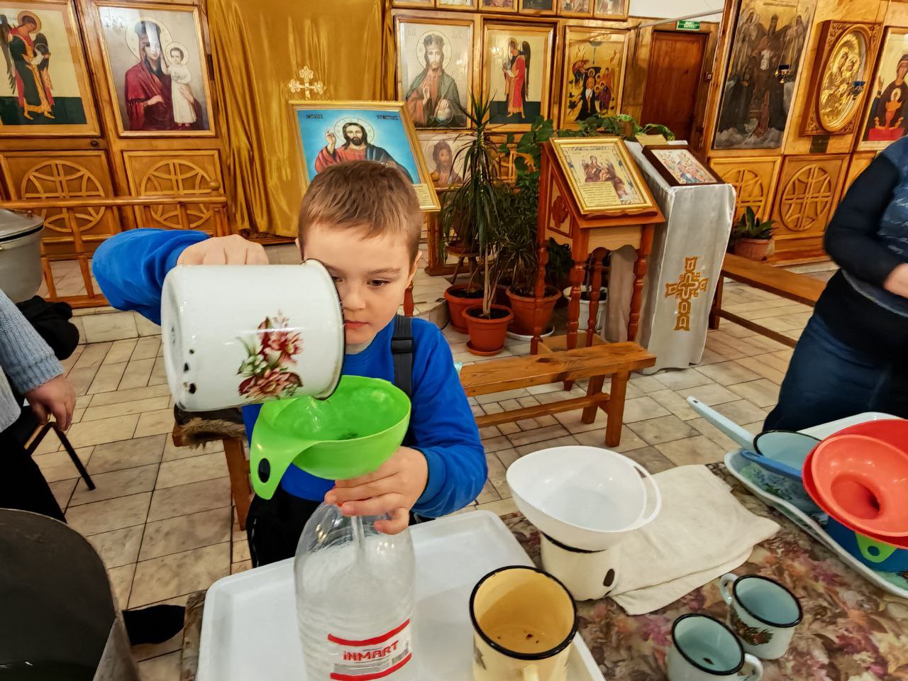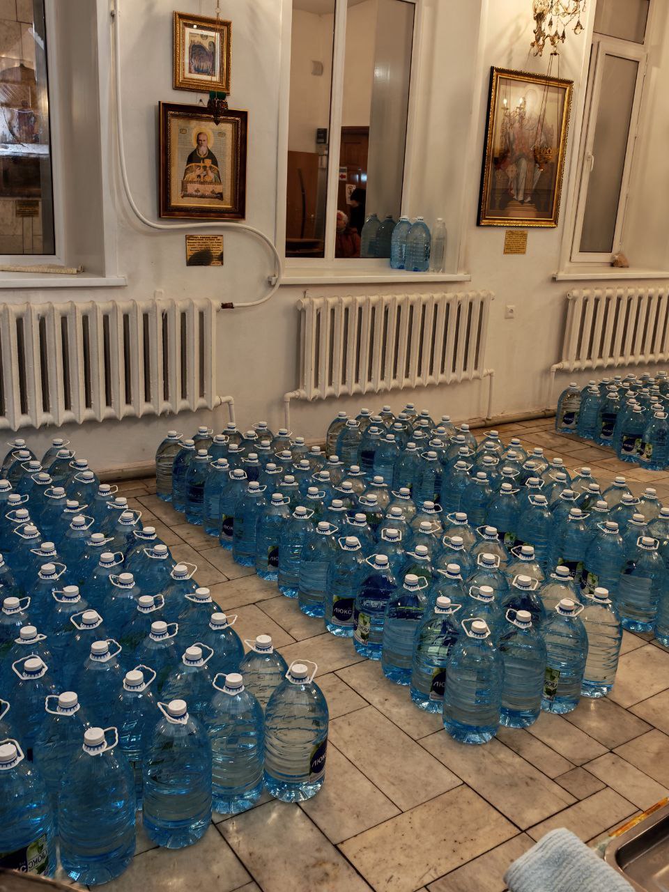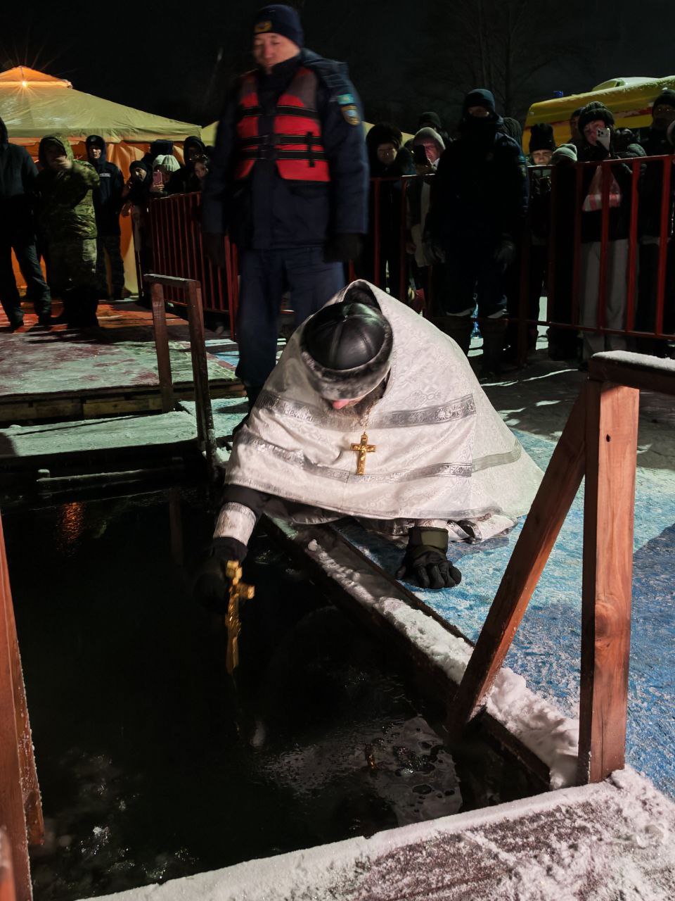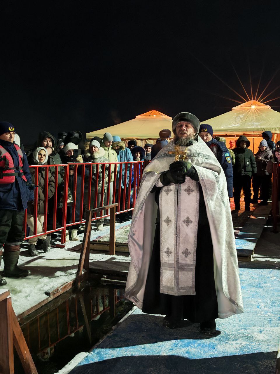 До полуночи в храме шли праздничные богослужения, в том числе, Чин великого освящения воды. А в 00.00 часов прошло освящение «Иордани» на реке Тобол. Забирать домой освященную крещенскую воду – это именно церковная традиция. В нашем храме ее можно набрать бесплатно, либо приобрести бутилированную освященную воду – пятилитровка по 400 тенге без наклейки и по 500 тенге со специальной наклейкой, подтверждающей совершение обряда.