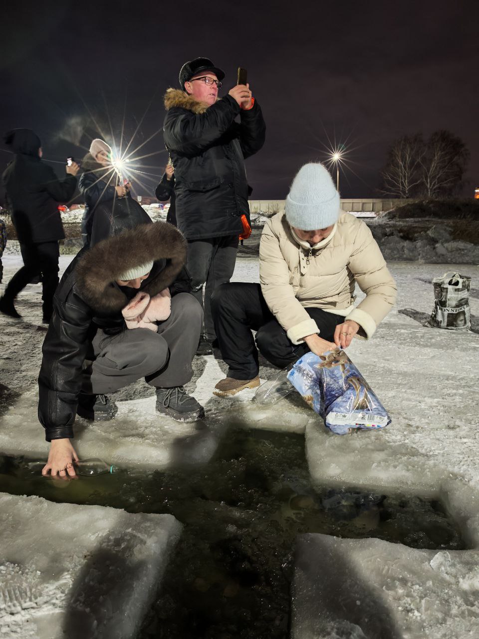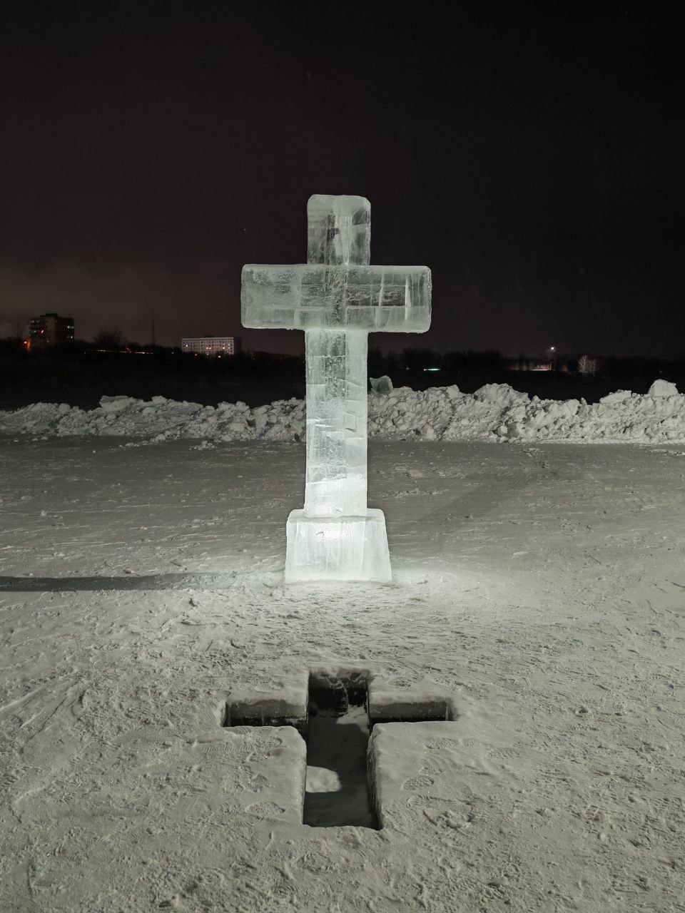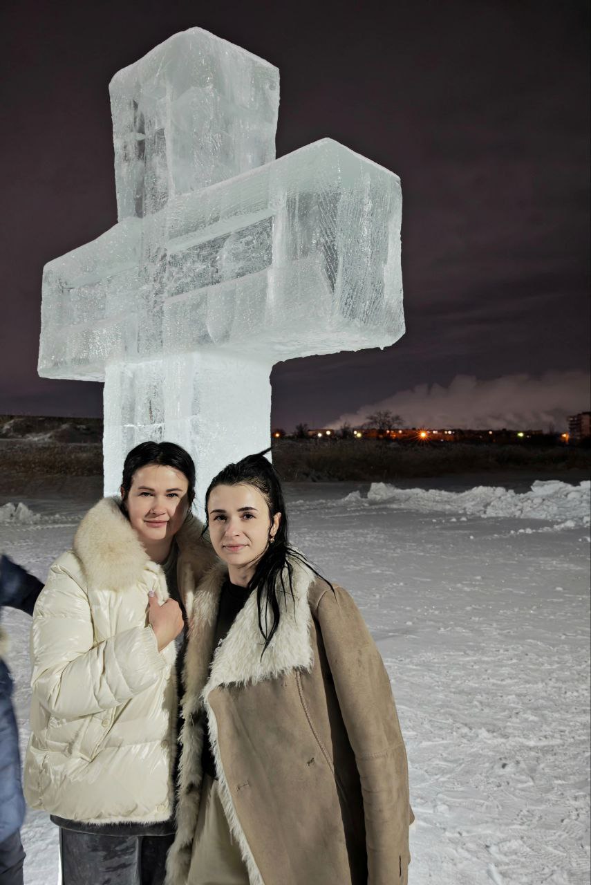 Некоторые набирали воду прямо из реки – для этого вырубили отдельную, небольшую, прорубь, ее, разумеется, также освятил батюшка. А рядом установили красивый крест изо льда. Его изготовили подрядчики, которые строили зимний городок.