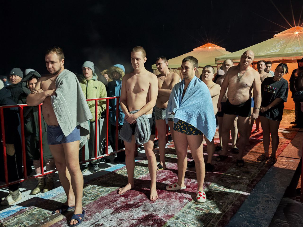 Но поскольку желающие моржевать все равно будут, город идет навстречу, обеспечивая людям необходимые условия для безопасности и комфорта. На реке Тобол, в районе храма, и в этом году оборудована купель, установлены теплые палатки для переодевания – мужские и женские, даже была организована торговля шашлыками, пловом, выпечкой и горячим чаем. Почти, как на День города или Наурыз.
