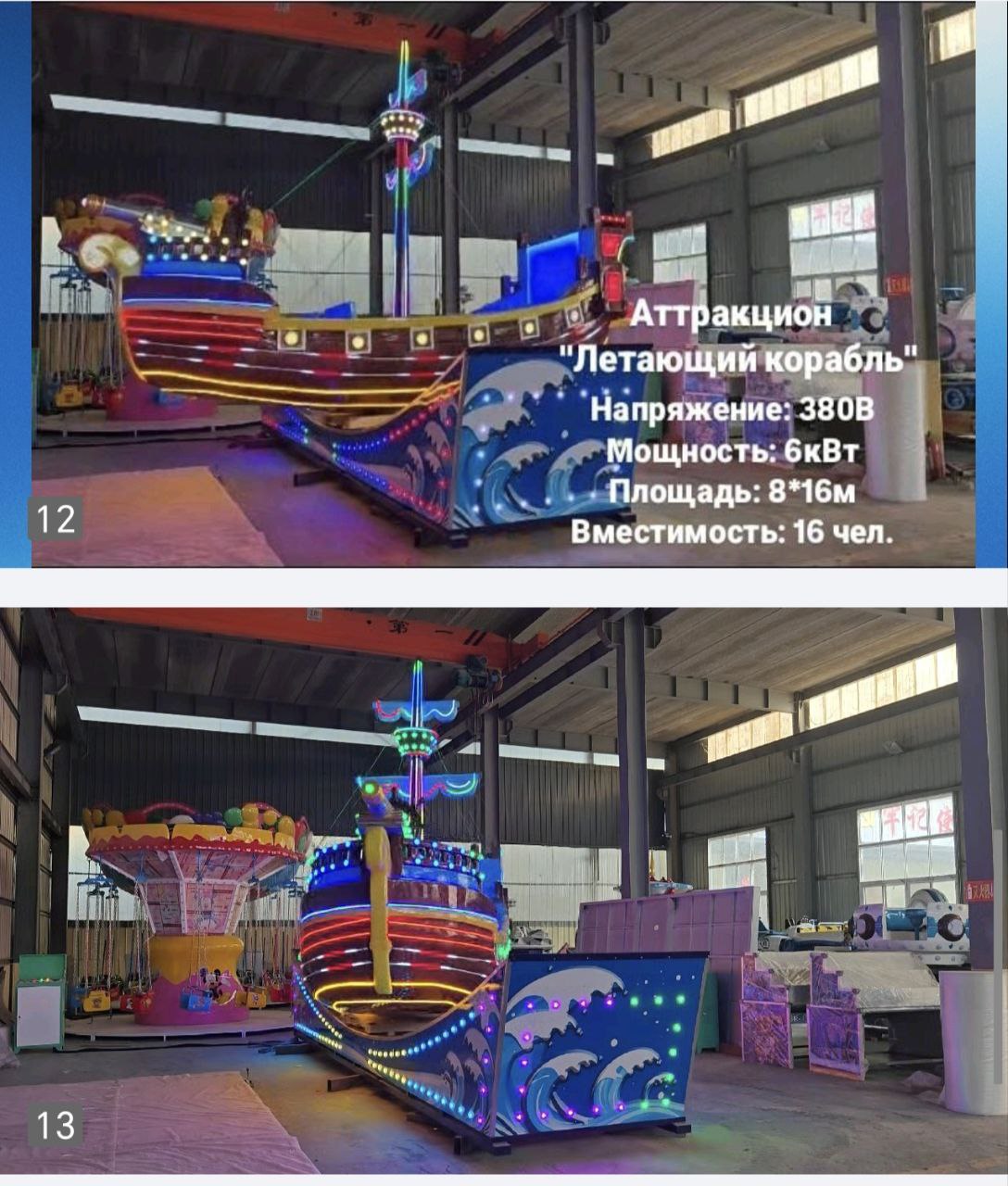 4 «Летающий корабль»: вместимость 16 человек, занимаемая площадь – 8*16 метров, общая площадь – 128 м2. Это небольшой аттракцион из категории орбитальных аттракционов, в котором корпус корабля вращается на 360 градусов по орбите, одновременно двигаясь по ней. Пассажиры сидят в кабине и по мере вращения корпуса постепенно поднимаются вверх.