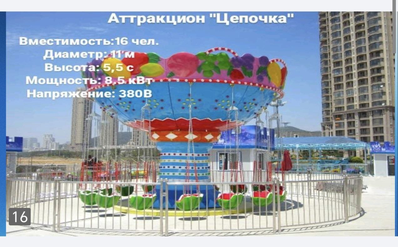 6 «Цепочка»: вместимость 16 человек. Высота – 7 метров, диаметр поворотного диска – 5 метров, диаметр вращения – 11 метров. Он сочетает в себе круговое вращение и скольжение по направляющей. Аттракцион отличается эстетичным дизайном, яркими цветами, а также реалистичной моделью из стеклопластика, выглядящей живо и насыщенно. Во время вращения дисковая часть кабины вращается плавно, а тело аттракциона скользит по направляющей – все это сопровождается живой музыкой и мерцающими световыми эффектами.