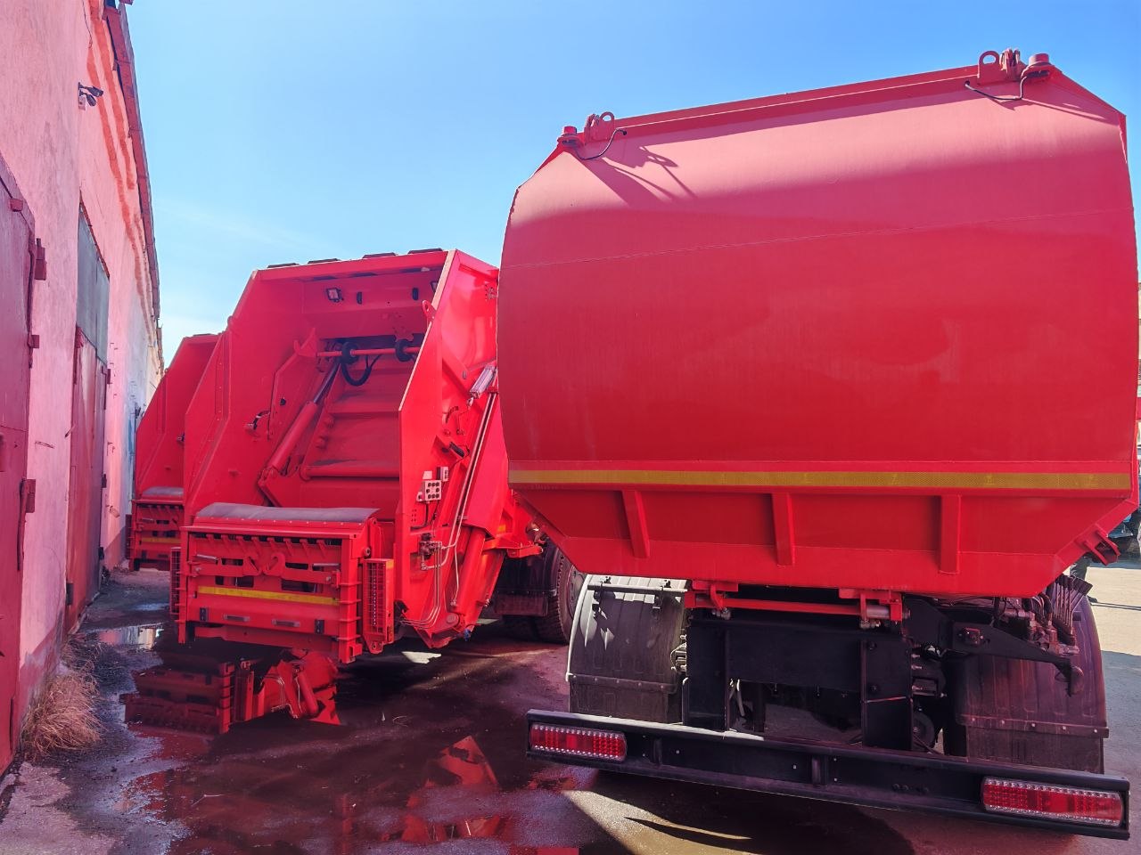 Это современные мусоровозы на базе «КАМАЗ» кокшетауской сборки с боковой и задней загрузкой ТБО. Мусоровозы могут работать как с евроконтейнерами, так и с обычными металлическими баками.