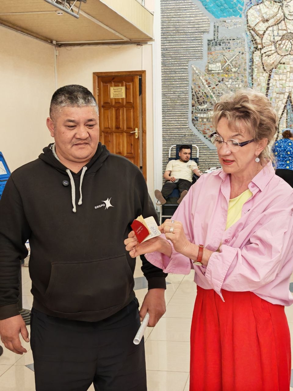 47-летний работник ССГПО Галымгерей Кенжегозин привлек к себе внимание наличием удостоверения донора СССР. Сотрудники центра крови намерены поднять архив и уточнить, сколько раз мужчина был донором, а пока торжественно вручили Галымгерею значок в виде капли крови.